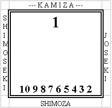 ![]() El Dojo El DOJO es el lugar o sala donde se practican las técnicas de cada arte marcial. Antiguamente los monjes budistas, dieron este nombre a la sala donde se reunían con el maestro para meditar (literalmente doujou significaría algo asi como 'lugar del camino'). El DOJO es una sala cuadrada o rectangular, y cada uno de sus lados tiene un nombre propio, y una categoría distinta. El lado principal es el KAMIZA donde se encuentra el estrado, el altar y las fotografías o caligrafías de los fundadores de algún arte marcial, es el sitio reservado a los maestros, visitantes de honor, y desde donde se presencian los katas. Frente al kamiza (lado opuesto) se halla el SHIMOZA de categoría inferior, está reservado para los alumnos, desde donde saludan antes y después de cada clase. A la izquierda del KAMIZA, se encuentra el SHIMOSEKI, o lado de los alumnos de menor categoría, y a la derecha el JOSEKI, o lado de los alumnos de grado más alto.
